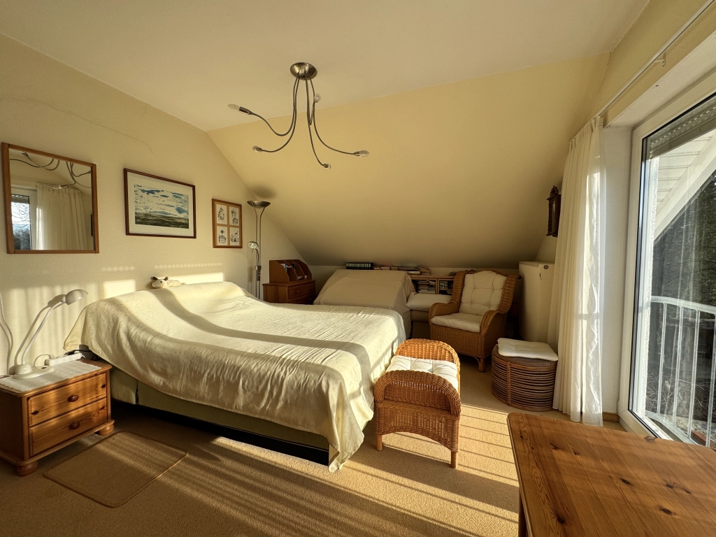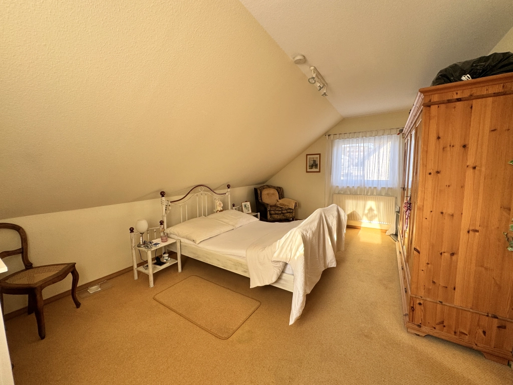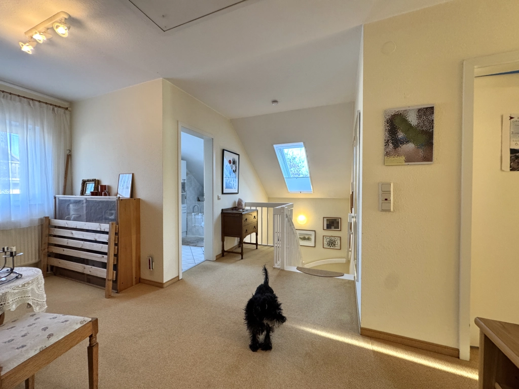 Die Wohnfläche verteilt sich auf Erd- und Dachgeschoss und umfasst insgesamt vier Zimmer, eine Küche sowie zwei Badezimmer – eines mit Badewanne, das zweite mit Dusche.