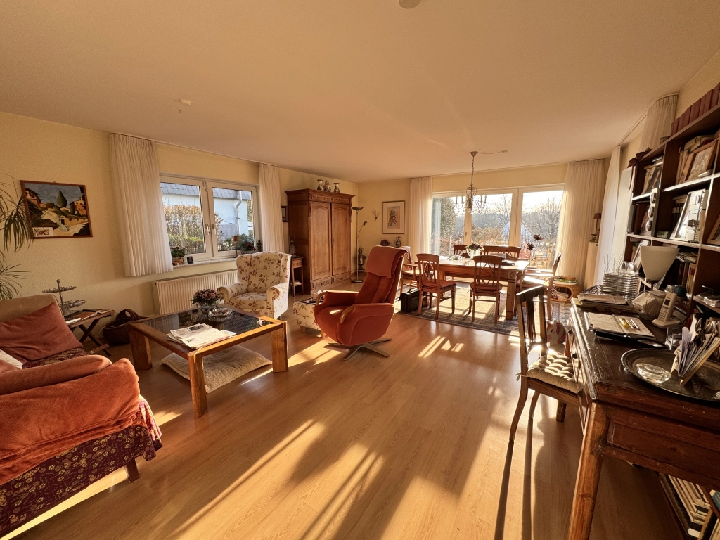 Der großzügige Wohn- und Essbereich bildet das Herzstück des Hauses und eröffnet den direkten Zugang zu zwei Terrassen sowie in den angenehm ruhig gelegenen Garten.