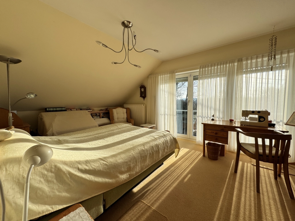 Auch in technischer und baulicher Hinsicht präsentiert sich das Haus solide ausgestattet. Beheizt wird die Immobilie über eine Gas-Zentralheizung von 2013. Die Fenster sind als isolierverglaste Kunststofffenster ausgeführt, was eine gute Wärmedämmung unterstützt. Die Rollläden sind ebenfalls teilweise elektrisch bedienbar – ein Plus an Komfort. Im Innenbereich sorgt eine angenehme Materialkombination aus Fliesen, Laminat und Teppichboden für eine funktionale und zugleich wohnliche Atmosphäre. Massivholztüren unterstreichen den wertigen Ausstattungscharakter.